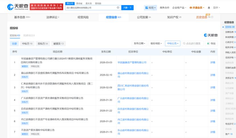 天眼查公开的工商信息与中标公告显示,该公司为国内BPO服务提供商,核心业务包含金融机构委外清收服务,曾中标多家国有银行、股份制银行的信用卡及信贷逾期清收项目。