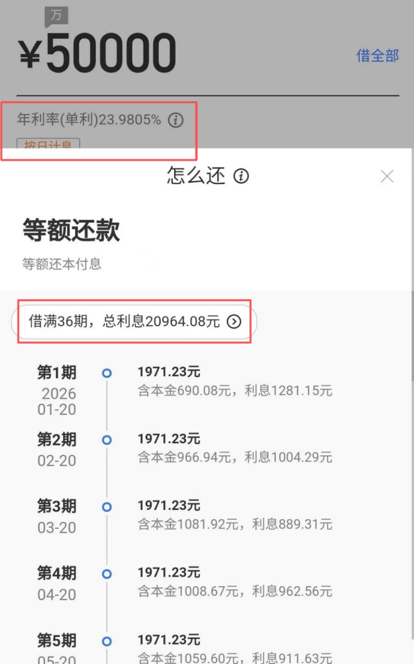 记者查阅用户提供的借款截图发现,一笔5万元、分36期偿还的借款,还款计划显示总计需支付利息20964.08元,借款界面标注的年化利率(单利)为23.9805%,贴近24%的相关利率监管标准。若借款人出现类似张鹏的情况,其叠加逾期罚息,该笔借款的综合资金成本将显著提高。