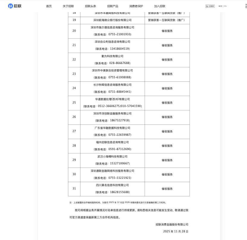 记者从招联消费金融官网披露的合作机构信息看到,公司目前合作的催收服务供应商共12家,其中包括四川莫名信息科技有限公司等。