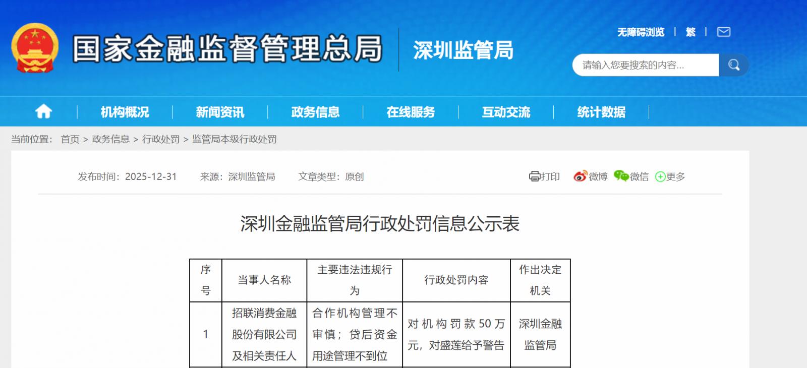 2025年12月31日,深圳金融监管局发布的行政处罚信息公示表显示,因合作机构管理不审慎、贷后资金用途管理不到位,招联消费金融股份有限公司被罚50万元,相关责任人盛莲被给予警告。
