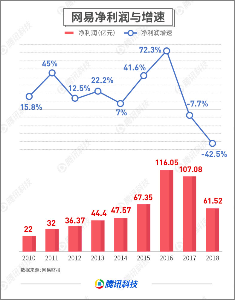 但营收增速并非最严重的事,最让丁磊后怕的是,网易的净利润增速迎来了更为惨烈的滑坡:在2017年首次净利润增速出现负增长后,2018年净利润同比下降42.5%至61.52亿元,仅达到2015年水平。