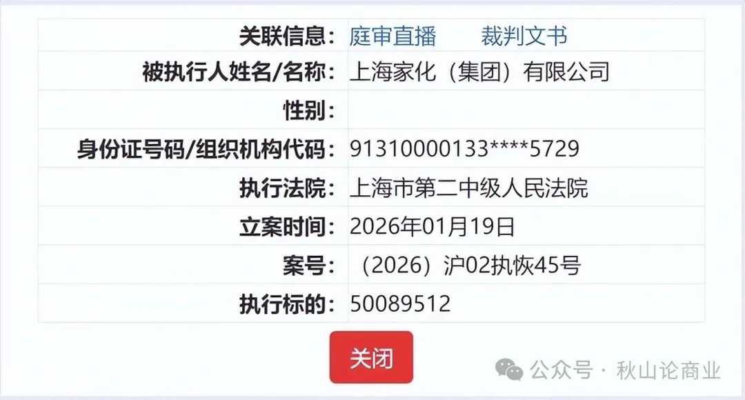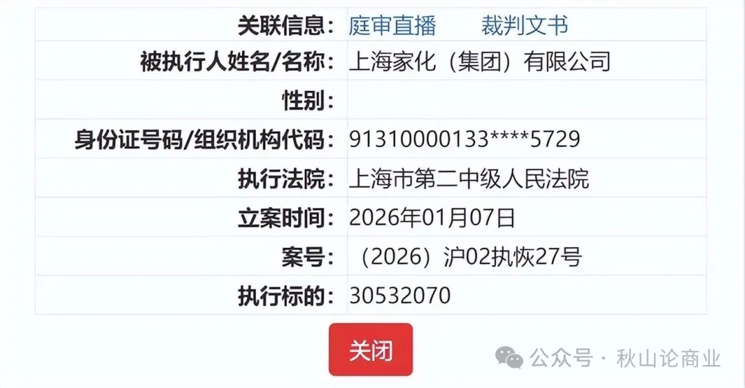 中国执行信息公开网显示,上海家化集团在2026年1月7日被列为被执行人,执行标的为3053.21万元,执行法院为上海市第二中级人民法院((2026)沪02执恢27号)。