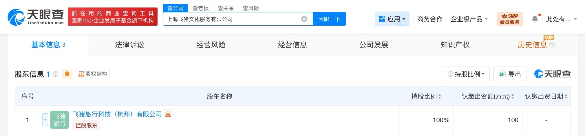 天眼查App显示,近日,上海飞猪文化服务有限公司成立,法定代表人为郑重,注册资本100万人民币,经营范围包括旅行社服务网点旅游招徕、咨询服务,会议及展览服务,互联网销售,信息咨询服务等,由飞猪旅行科技(杭州)有限公司全资持股。