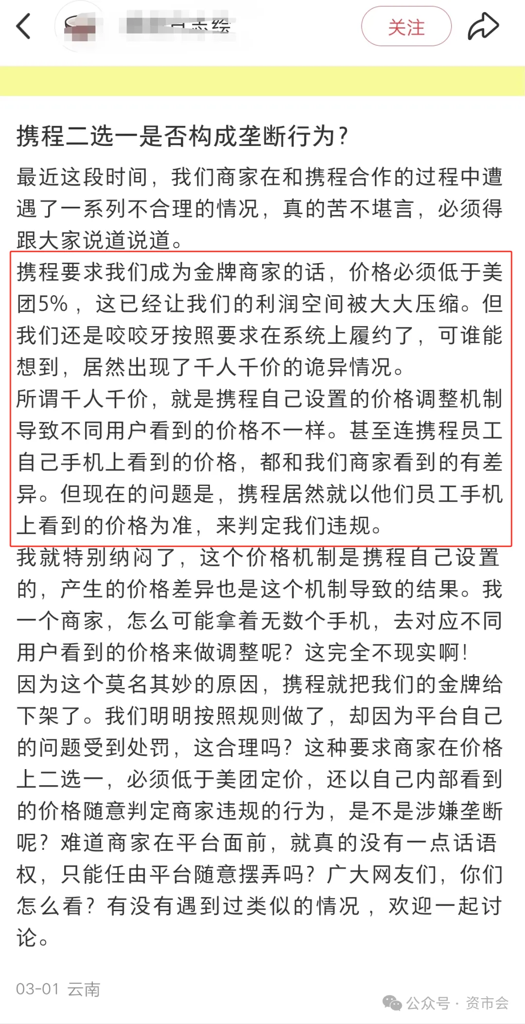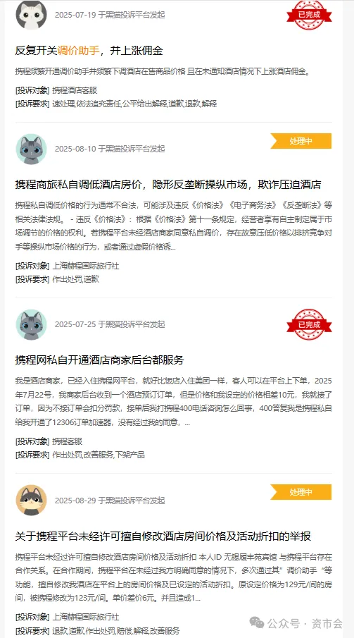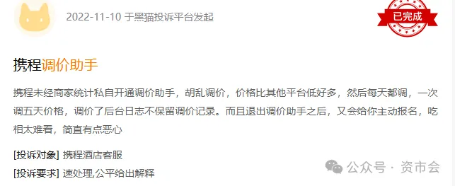 也有携程合作商家直接投诉其滥用市场支配地位,实施“二选一”政策。该商家指出,携程利用其市场优势地位,通过“低价对标”“调价助手”等工具,强制要求商家在携程平台的价格不得高于其他渠道(包括酒店官网、线下前台等)。若商家不配合,便以“价格倒挂”为由扣减诚信分、限制流量甚至下架房源,变相逼迫商家接受其垄断定价策略。