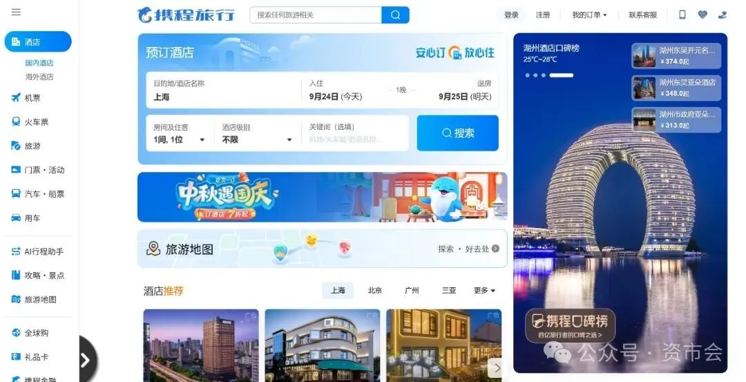据交银国际测算,2024年以GMV(商品交易总额)计,携程在酒旅市场的GMV市占率达56%,远超美团(13%)、飞猪(8%)和抖音(3%)。若叠加同程的13%市场份额,“携程系”几乎占据OTA市场70%的市场份额。