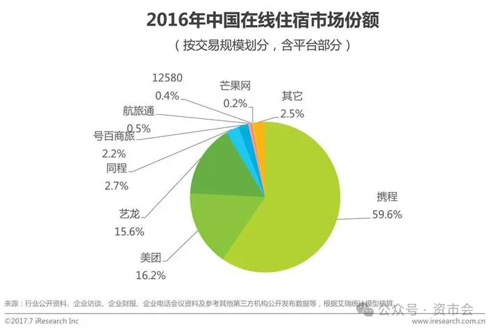 至此,携程、同程、艺龙、去哪儿、智行、途牛等成为“一家人”。根据艾瑞数据,到2016年,携程及去哪儿、同程、艺龙等合计占有中国在线住宿市场近80%份额,远超美团(16.2%)。