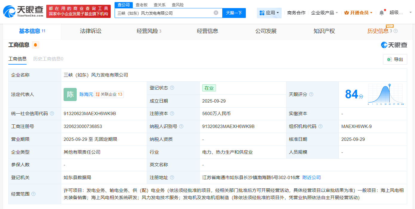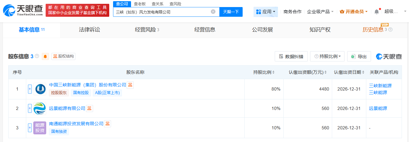 三峡能源等在江苏南通成立风力发电公司 注册资本5600万观点