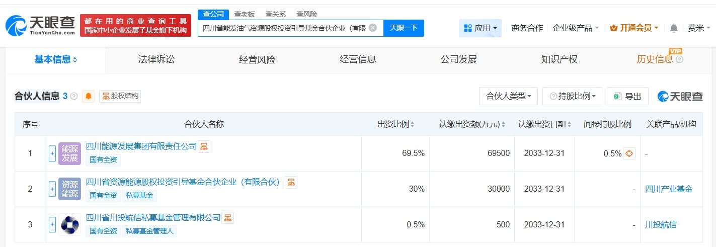 天眼查App显示,近日,四川省能发油气资源股权投资引导基金合伙企业(有限合伙)成立,执行事务合伙人为四川省川投航信私募基金管理有限公司,出资额10亿人民币,经营范围为创业投资,由四川能源发展集团有限责任公司、四川省资源能源股权投资引导基金合伙企业(有限合伙)、四川省川投航信私募基金管理有限公司共同出资。