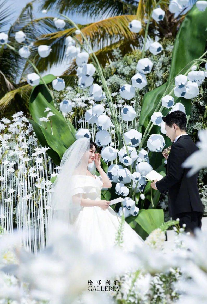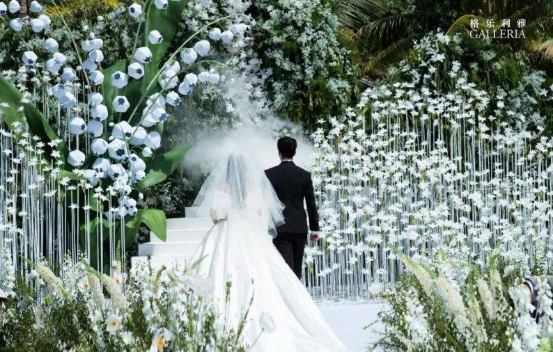 两人的婚礼现场由格乐利雅打造,以巨型铃兰花为造型的仪式区,烂漫而又神圣。