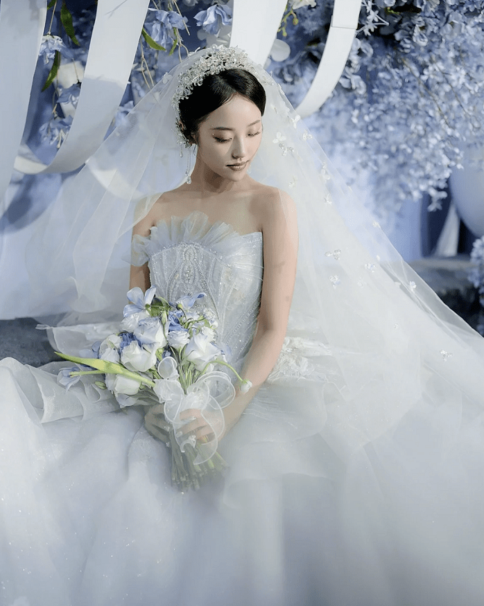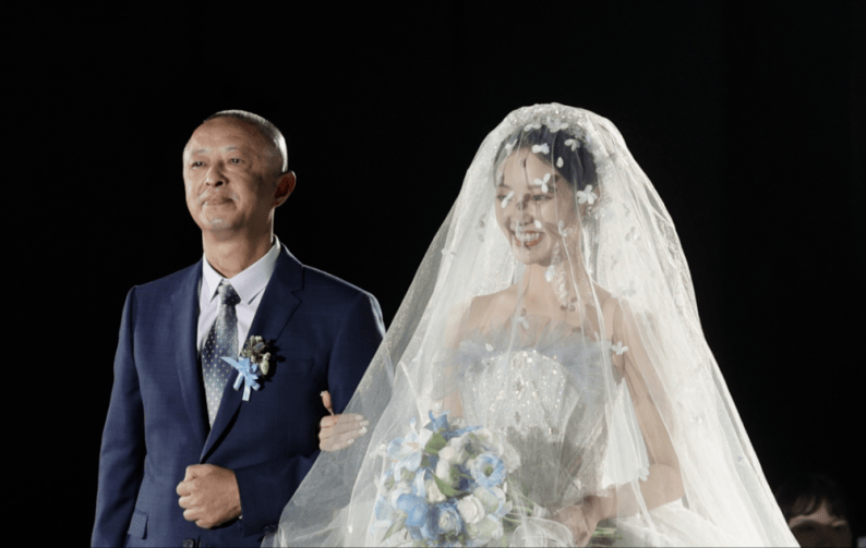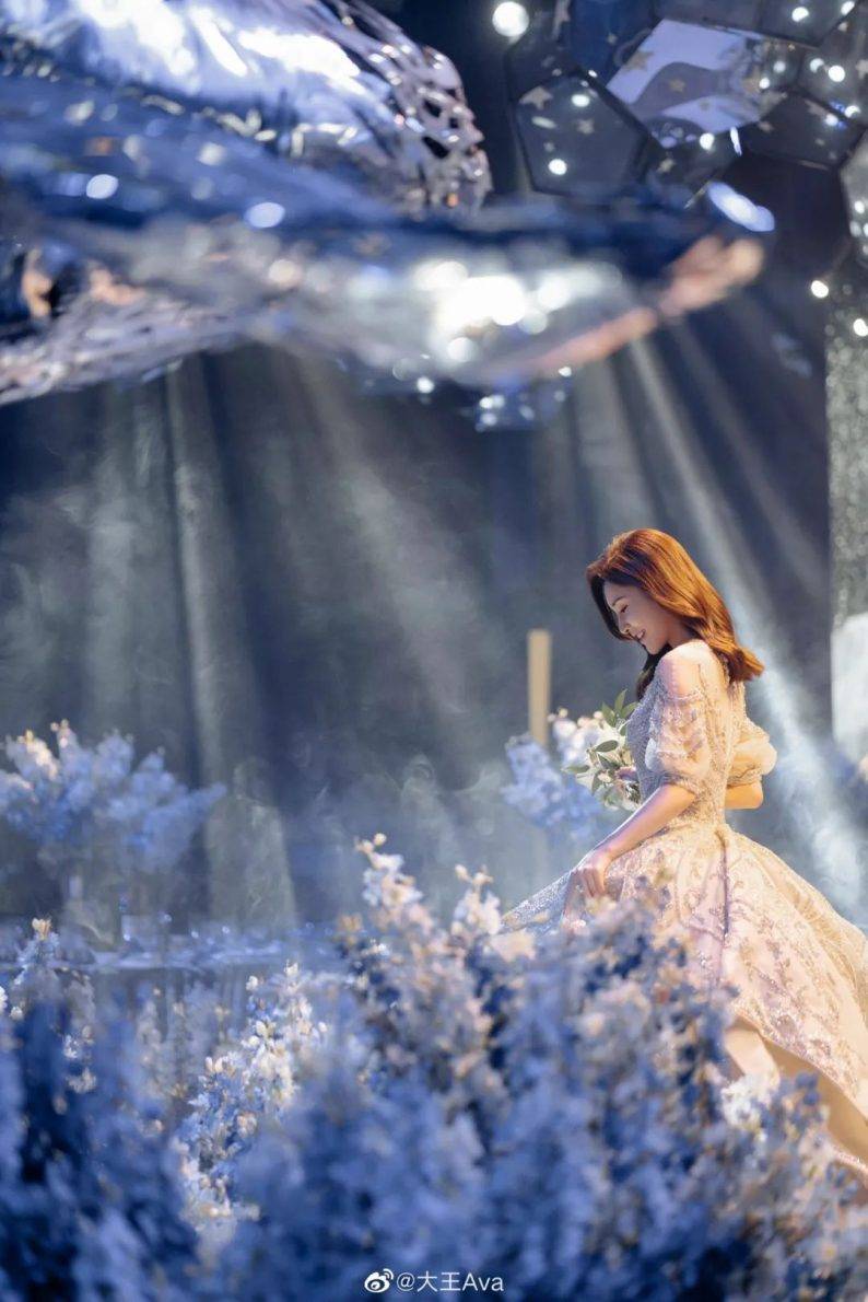 身披圣洁白纱的王艺洁更是表现得落落大方,一旁的老公也是身姿挺拔,气质不凡,两人并肩而立的画面着实相当养眼,整个仪式现场的布设也是颇具水准,蓝色与白色交相呼应,搭配上精致绚烂的花艺装饰,巧妙营造出浪漫唯美的氛围感。