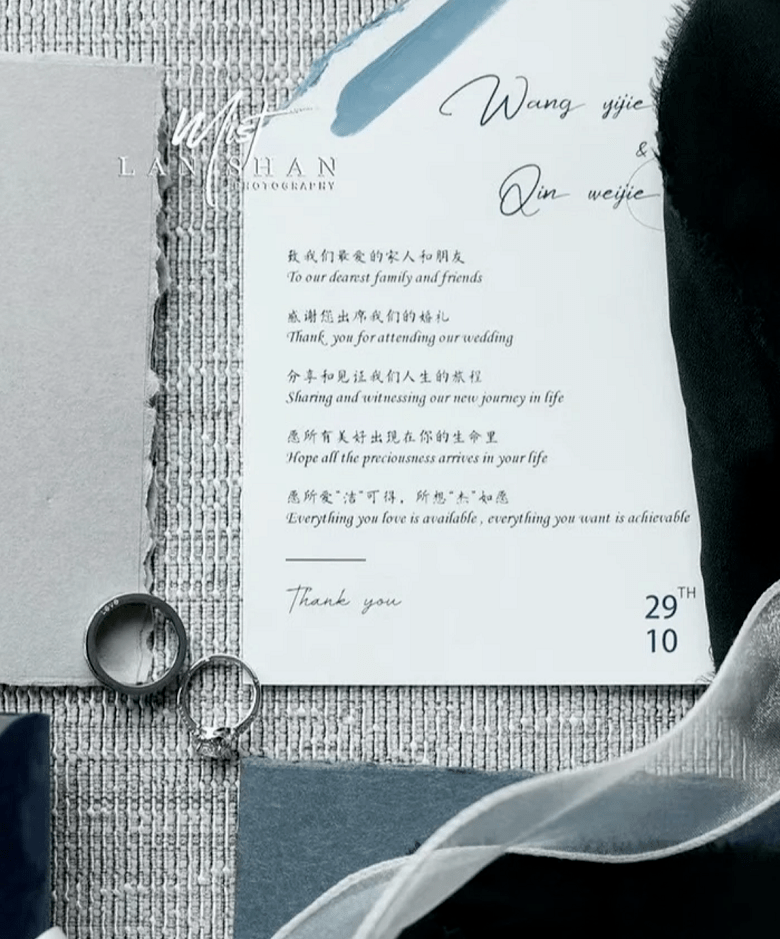 此外,婚礼的请柬也遭到曝光,请柬设计同样别出心裁,还运用了颇具高级感的丝带装饰,在照片中,王艺洁与老公的结婚对戒也一并晒出,从材质到细节足以看出两人的确品味不俗。