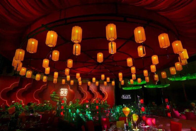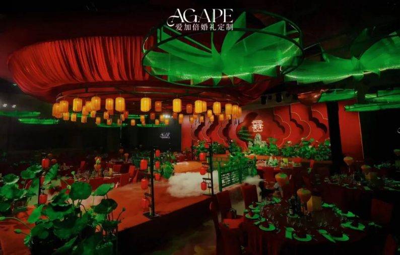 张常宁和吴冠希的回门宴则定在了南京,现场采用中式设计,数十盏红色灯笼悬在大厅上方,无数荷花和荷叶环绕在周围,犹如仙境。