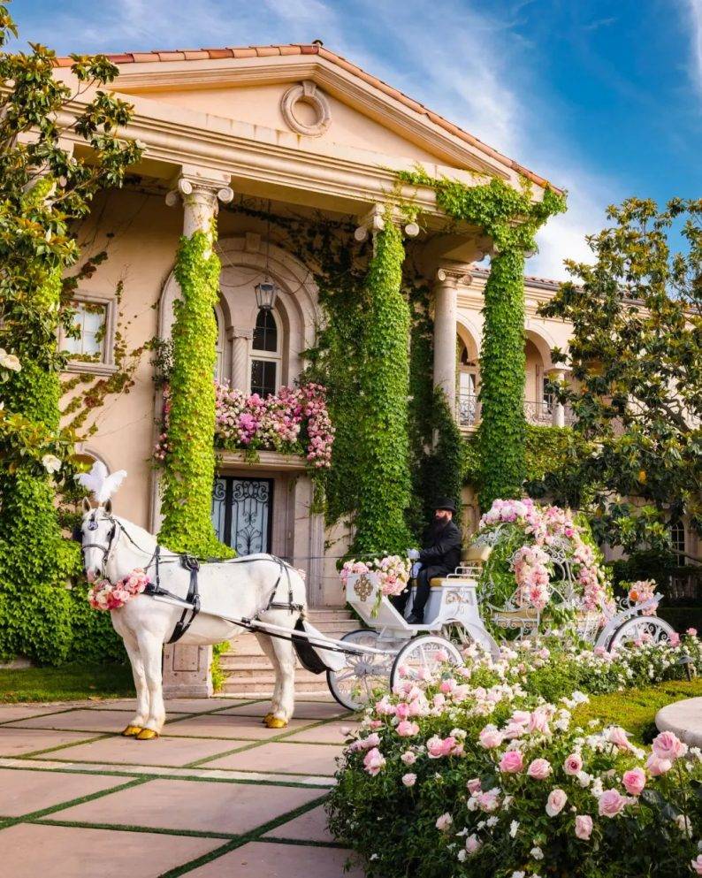 现场布置得超级梦幻,铺满了来自Marks Garden的不同色调的粉色、香槟色、白色鲜花,每一朵都像是从童话故事中摘下来的一样,还有一辆“南瓜马车”。