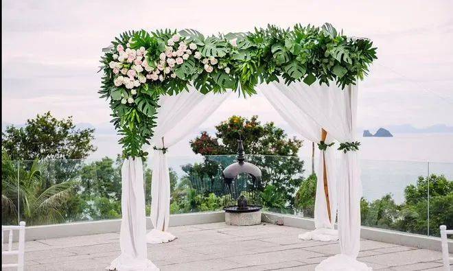 日落时分,由鲜花装扮的棕榈树下,这对新人在亲友们的祝福和见证下宣誓和亲吻,完成了婚礼仪式。