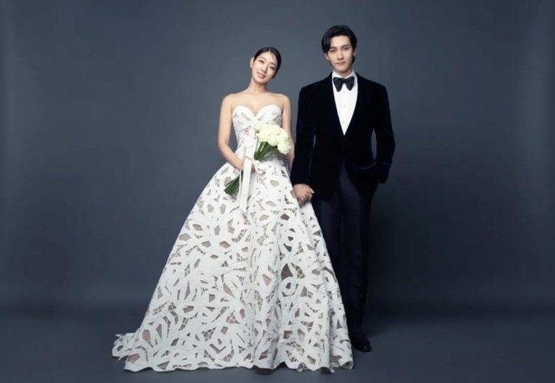 婚纱照中,两人挽手甜笑,朴信惠虽有孕在身,却仍宛如仙女下凡般被花束簇拥,婚纱照比电影剧照还美,马上就引起关注。