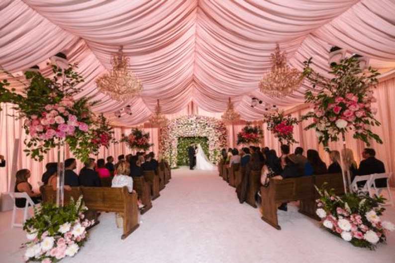 举办仪式和派对的粉色帐篷也打造得很浪漫,帐篷里装饰了数百朵粉红玫瑰和几盏枝形的金色吊灯。