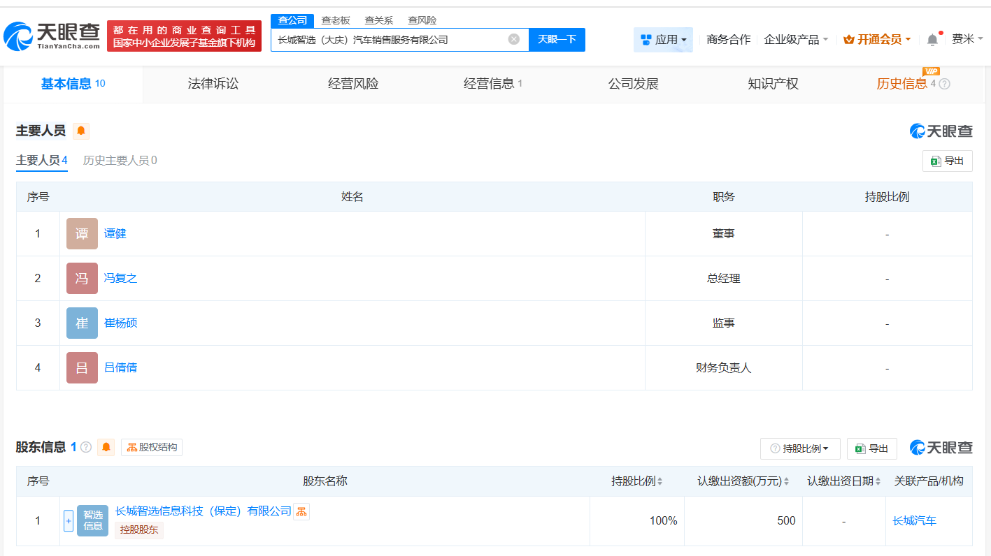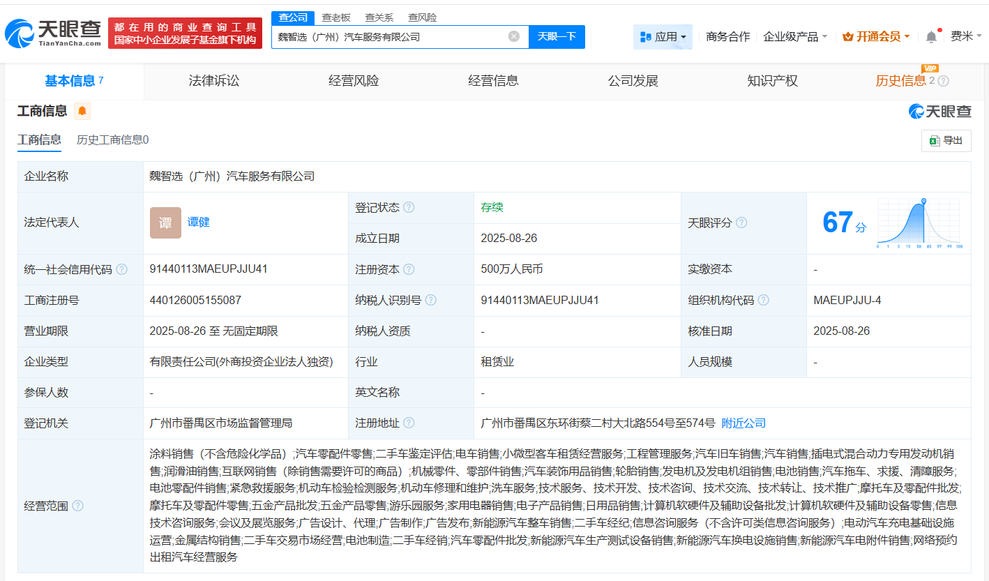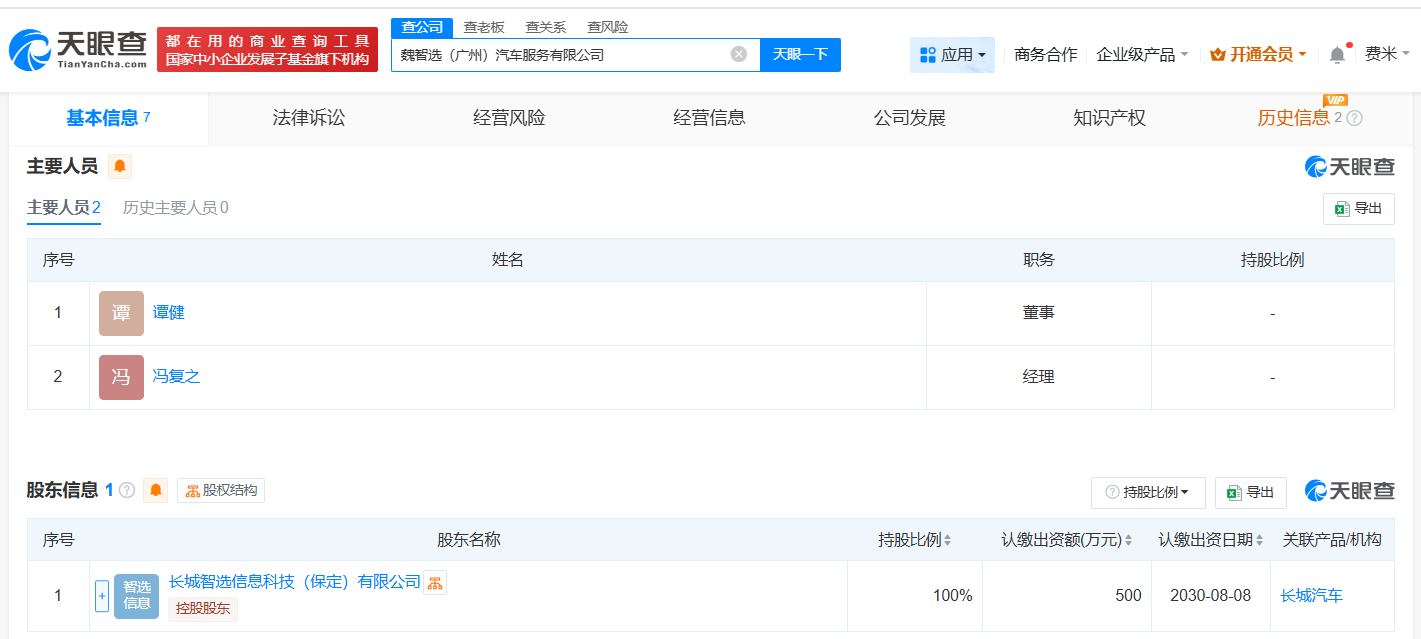 天眼查工商信息显示,近日,魏智选(广州)汽车服务有限公司、长城智选(大庆)汽车销售服务有限公司成立,法定代表人均为谭健,注册资本均为500万人民币,经营范围包括技术服务、技术开发、技术咨询、技术交流、技术转让、技术推广等。