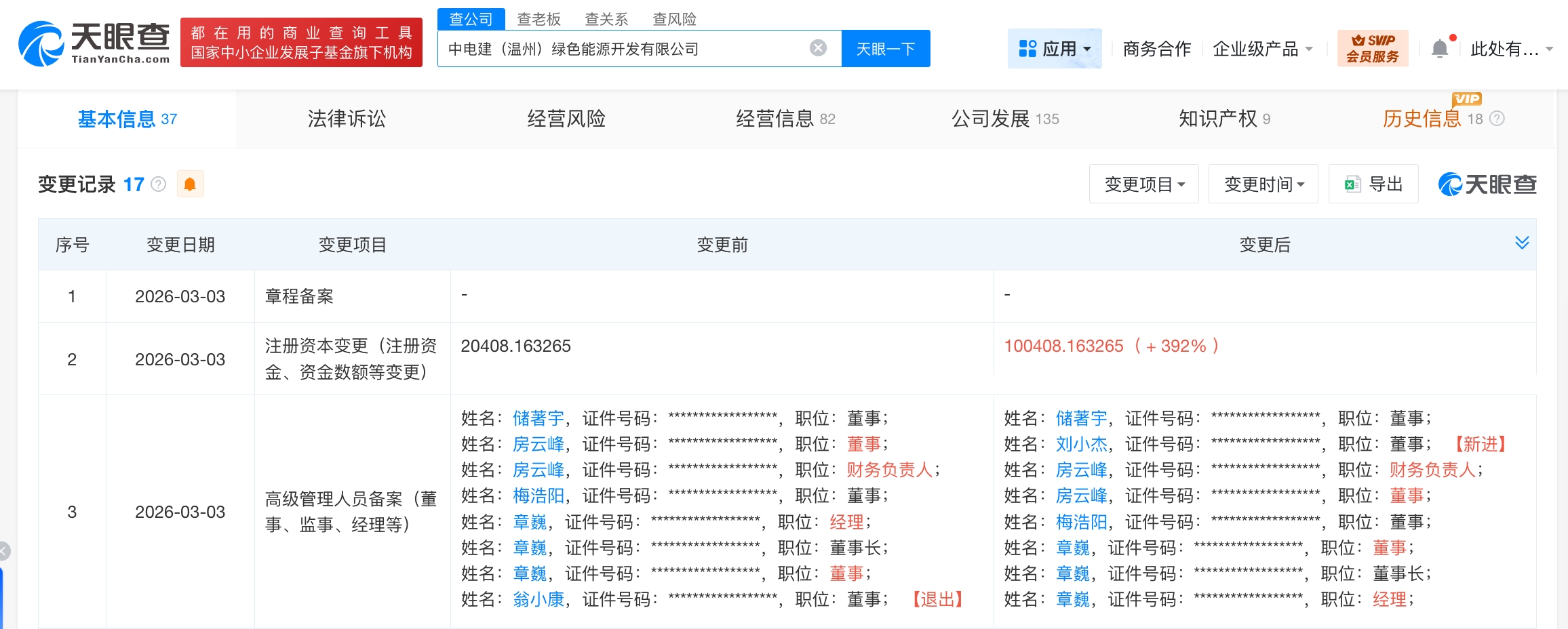 天眼查工商信息显示,近日,中电建(温州)绿色能源开发有限公司发生工商变更,注册资本由约2.04亿人民币增至约10.04亿人民币,增幅392%,同时,部分高管也发生变更。