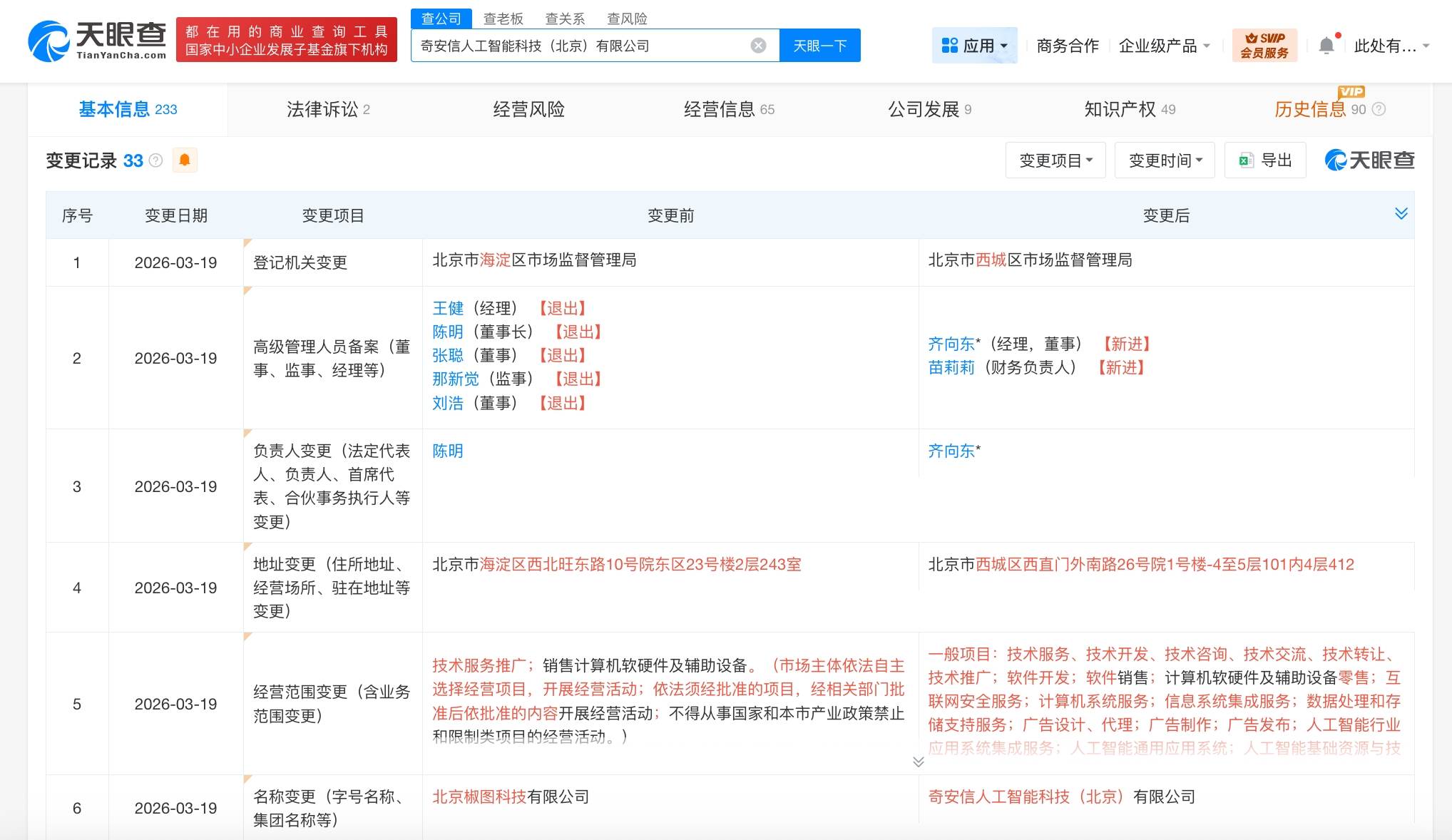 天眼查App显示,近日,北京椒图科技有限公司发生工商变更,企业名称变更为奇安信人工智能科技(北京)有限公司,陈明卸任法定代表人、董事长,由齐向东接任法定代表人,并担任经理、董事,同时,多位高管发生变更。
