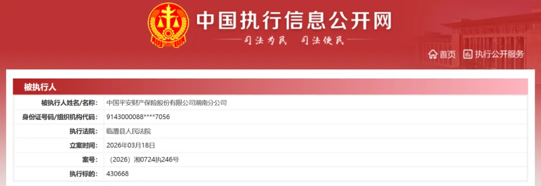 3月18日,平安财险湖南分公司被常德市临澧县人民法院立案执行,执行标的43.07万元。企查查显示,该执行案件由一起车险交通事故理赔纠纷引发。该公司现存被执行人信息3条,被执行总金额 52.15万元。该公司历史被执行人信息多达397条,被执行总金额6826.75万元。