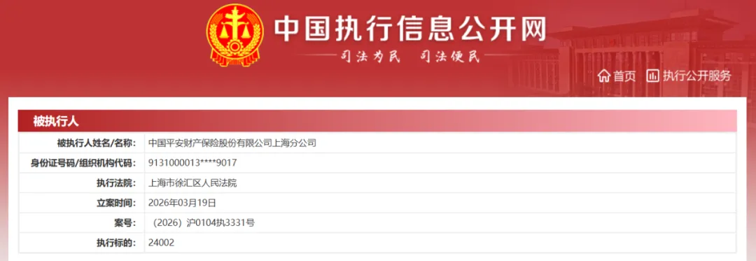 据中国执行信息公开网提供的信息显示,3月19日,平安财险上海分公司被上海市徐汇区人民法院立案执行,执行标的2.4万元。该公司现存5条被执行人信息,被执行总金额59.26万元。该公司现存终本案件信息162条,被执行标的总金额5535.48万元,未履行总金额1707.91万元,未履行比例 30.85%。