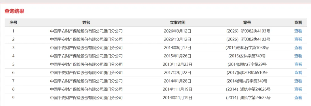 日前,中国平安财产保险股份有限公司(简称“平安财险”)多家省级分公司被法院立案执行。据不完全统计,截至目前,平安财险已有15家省级分公司沦为被执行人,且部分分公司近期多次被法院立案执行。