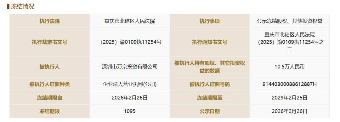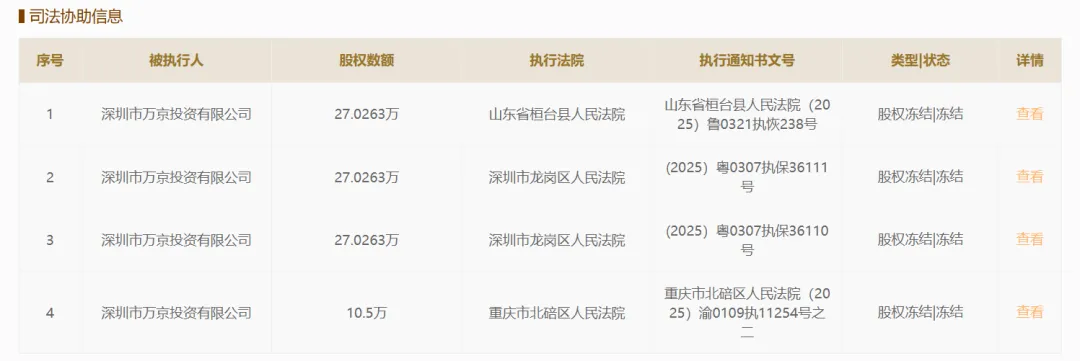 此前,2月11日,万京投资持有的平安财险一笔出资额为27.03万元的股权两次被深圳市龙岗区人民法院冻结,冻结期限至2029年2月10日,这是该公司持有的平安财险全部股权。该笔股权2025年9月已被山东省桓台县人民法院司法冻结,冻结期限至2028年8月31日。