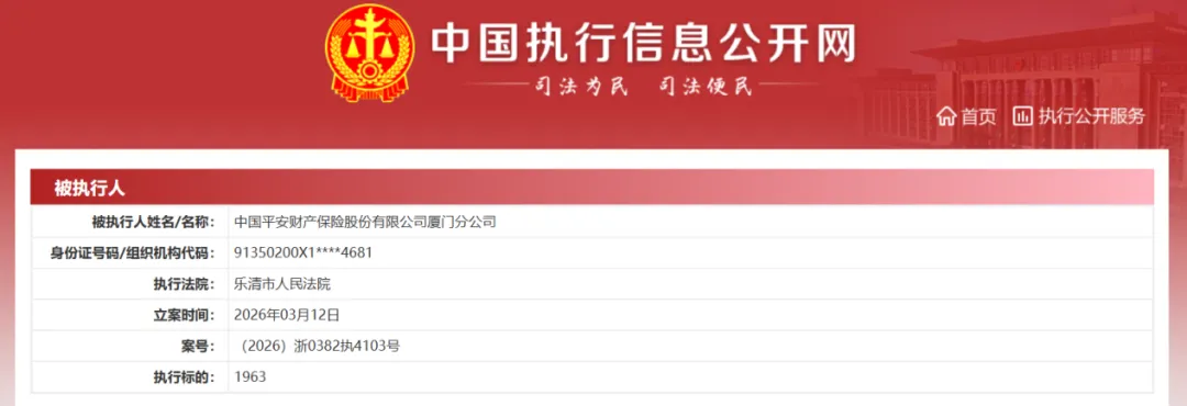 3月12日,平安财险厦门分公司被浙江省乐清市人民法院列入被执行人名单,执行标的1963元。该公司历史被执行人信息达420条,被执行总金额 6617.83万元。该公司现存终本案件信息8条,被执行标的总金额342.81万元,未履行总金额293.69万元,未履行比例85.67%。