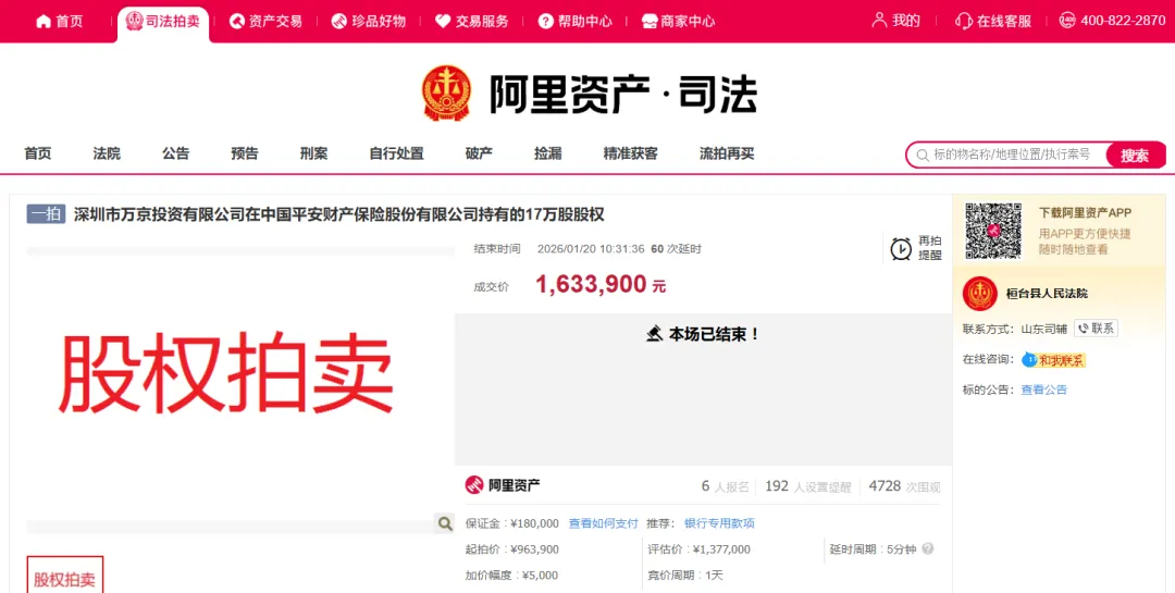 阿里资产司法拍卖平台显示,今年1月20日,山东省桓台县人民法院将万京投资持有的平安财险17万股股权拍卖,起拍价为96.39万元,最终成交价为163.39万元,每股成交均价为9.61元。