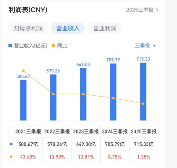 回溯历史数据,当前业绩增速明显放缓。数据显示,2022年至2024年前三季度的营收增速分别为13.90%、13.81%和8.75%,而2025年前三季度仅为1.35%