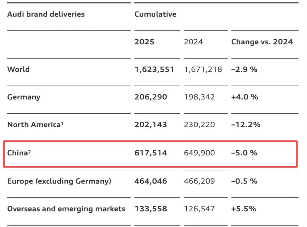 日前,奥迪正式发布2025年业绩。数据显示,2025年奥迪全年销量162.36万辆,同比下滑2.9%,2024年同期为167.12万辆。