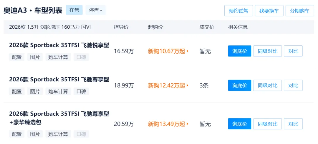 《次世代车研所》栏目在汽车之家上看到,厂商指导价为16.59万—20.99万元的奥迪A3,有成都经销商给出的报价仅为10.67万元起,并且是2026款新车,相当于六折促销。