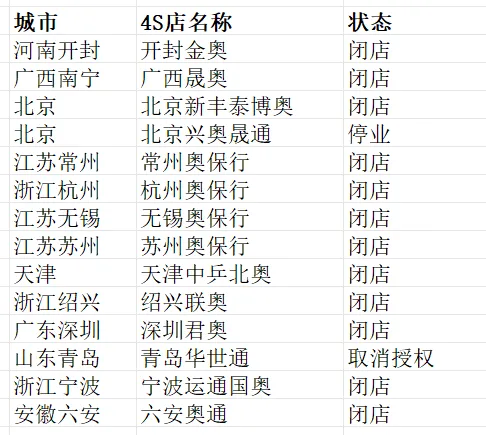 《次世代车研所》栏目根据各地车主们的反馈统计,自2025年底以来,除了开封金奥之外,还有十余家奥迪4S店闭店,涉及广西、江苏、浙江、天津、广东、山东、安徽等多个省市。