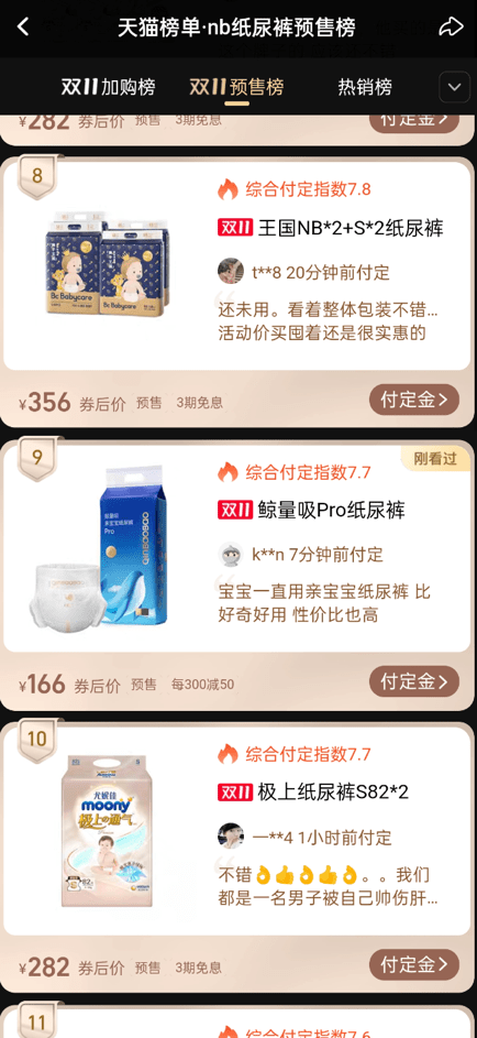 据悉,亲宝宝从2021年正式开启渠道布局,今年是属于亲宝宝第二个真正意义上的全渠道“双11”。在今年第一波预售期间,亲宝宝纸尿裤系列就表现亮眼,其中鲸量吸Pro纸尿裤更是销售火爆。亲宝宝鲸量吸Pro纸尿裤于今年6月全新升级上市,凭借着过硬的产品品质,得到众多消费者的认可,并形成了良好的品牌口碑。而这也反映到“天猫纸尿裤预售榜单”的数据表现上,亲宝宝鲸量吸Pro纸尿裤位于预售榜单第九位,综合付定指数高达7.7,进入第一梯队。
