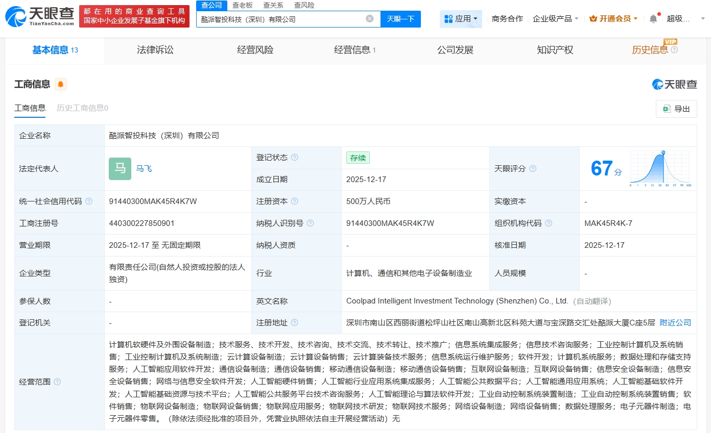 近日,酷派智投科技(深圳)有限公司成立,法定代表人为马飞,注册资本500万人民币,经营范围包括计算机软硬件及外围设备制造、人工智能应用软件开发、人工智能行业应用系统集成服务、人工智能公共数据平台等。