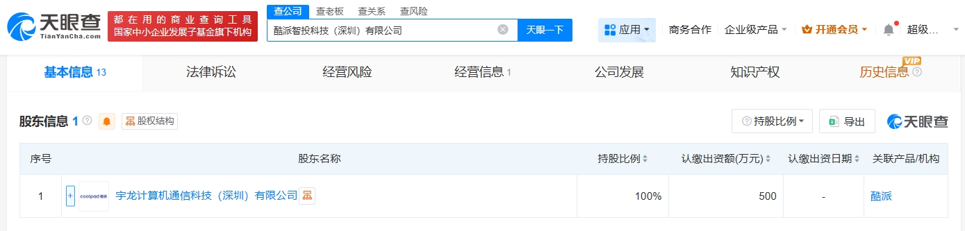 天眼查App显示,近日,酷派智投科技(深圳)有限公司成立,法定代表人为马飞,注册资本500万人民币,经营范围包括计算机软硬件及外围设备制造、人工智能应用软件开发、人工智能行业应用系统集成服务、人工智能公共数据平台等。股东信息显示,该公司由酷派关联公司宇龙计算机通信科技(深圳)有限公司全资持股。