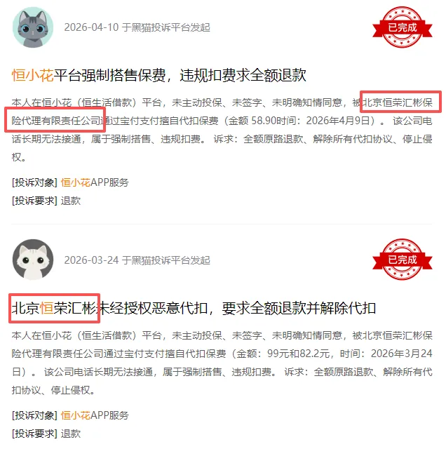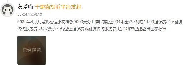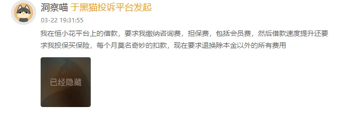 “在恒小花借款25000元,每期强制额外收取高额担保费+融资咨询服务费”“借款18000元,还款时每次收取300元左右的担保费和服务费”“被恒小花从银行卡扣了两笔199元的会员费”……
