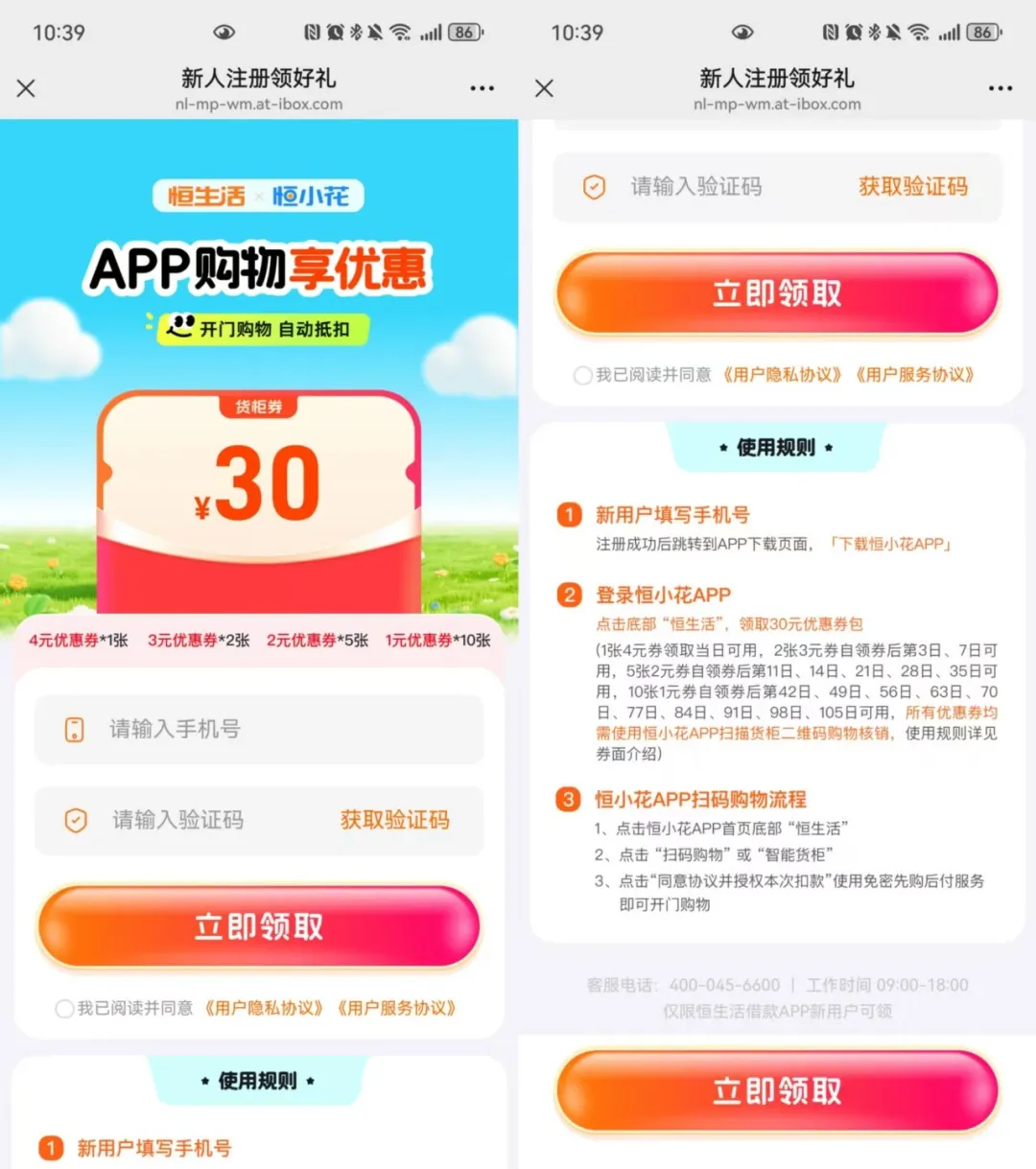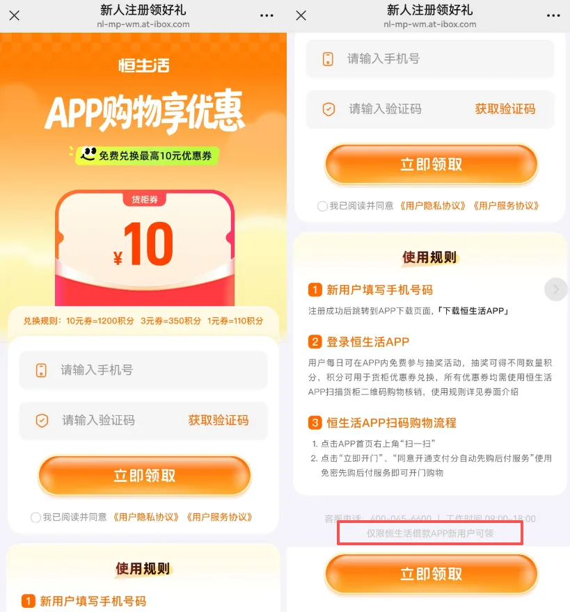 在恒生活的微信服务号对话框点击“立享优惠”按钮,跳转至恒生活“新人注册领好礼”的H5页面,通过该页面注册成为新用户,即可领取相关优惠券。该页面底部有一行十分不起眼的小字“仅限恒生活借款APP新用户可领”,恒生活借款便是恒昌系助贷业务的“第四代马甲”。