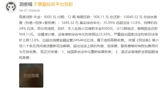 高息费是最主要的问题之一。如4月27日一用户投诉称,其借款本金9000元,分12期偿还,每期还款904.11元,实际年化利率为35.99%。