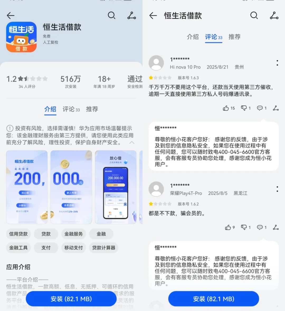 目前,恒小花已全面改名为恒生活借款。在应用商店搜索“恒小花”,排在第一位的便是恒生活借款,但恒生活借款应用详情页的评论区,仍残留着恒小花的“痕迹”。