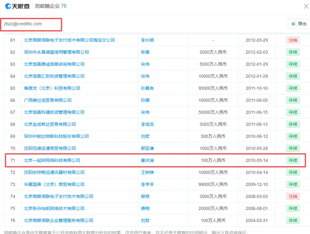 乐享无限起初由秦洪涛间接控股,在两次股权变更后,由深圳越享云图科技有限公司100%持股。看似与恒昌系再无关系,但天眼查显示,乐享无限与恒昌系旗下多家企业共用邮箱,包括秦洪涛直接担任法定代表人且仍在存续的北京一起拼网络科技有限公司。