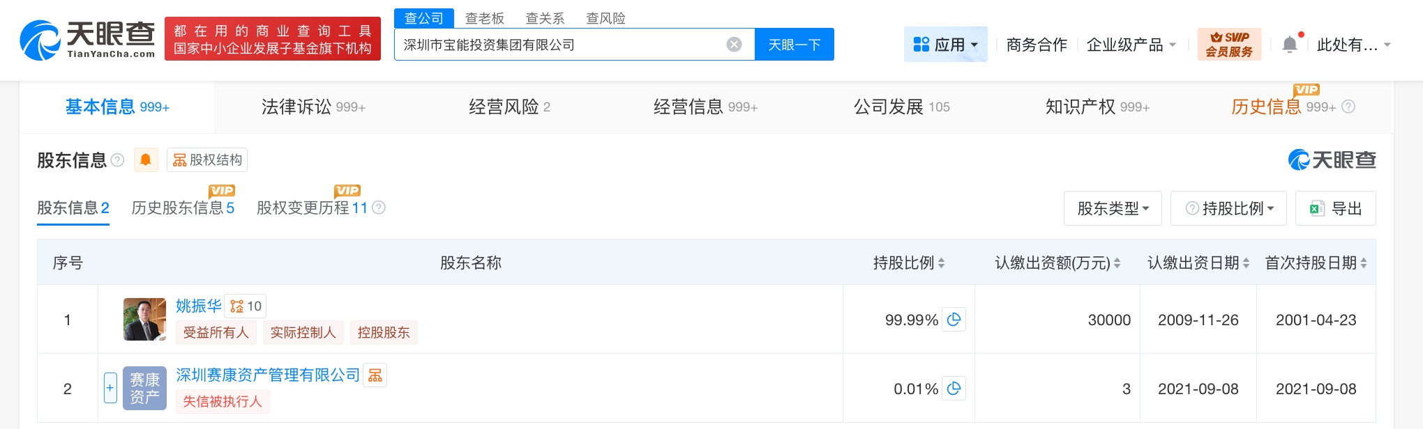 深圳市宝能投资集团有限公司成立于2000年3月,法定代表人为姚振华,注册资本约3亿人民币,经营范围包括投资兴办实业、投资文化旅游产业、建筑设备的购销与租赁等,由姚振华、深圳赛康资产管理有限公司共同持股。风险信息显示,该公司现存40余条被执行人信息,被执行总金额超484亿元,此外,该公司还存在多条限制消费令、失信被执行人(老赖)及终本案件信息。