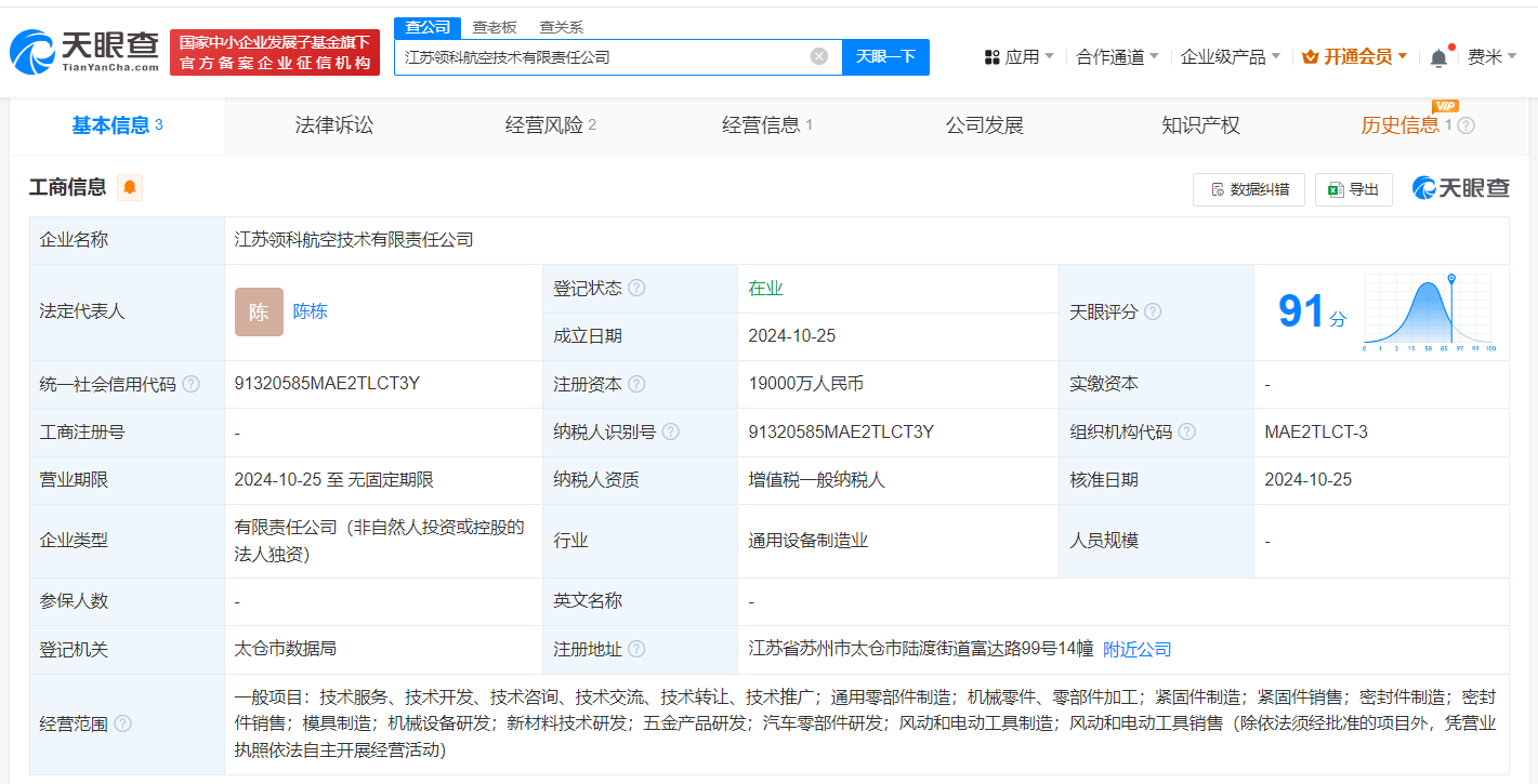 天眼查App显示,近日,江苏领科航空技术有限责任公司成立,法定代表人为陈栋,注册资本1.9亿人民币,经营范围含通用零部件制造、紧固件制造、密封件制造、模具制造、机械设备研发、新材料技术研发等。