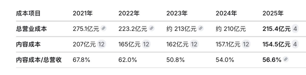 从2021年到2025年,爱奇艺的内容成本占总营收比例从67.8%下降到56.6%,但整体内容成本依然偏高。
