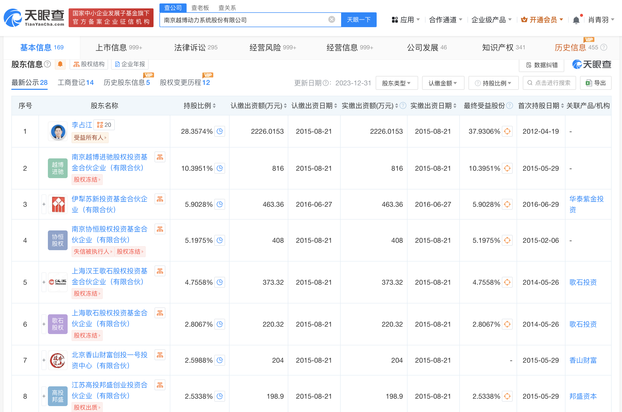 越博退(300742)成立于2012年4月,法定代表人为李占江,注册资本约7849.9万人民币,经营范围含汽车动力系统技术研发、检测,车辆系统及零部件的研发、生产、检测、销售、技术咨询,新能源汽车动力总成系统、电机及控制系统、整车控制系统的研发、生产、检测、销售、技术咨询等。股东信息显示,该公司由李占江、南京越博进驰股权投资基金合伙企业(有限合伙)、伊犁苏新投资基金合伙企业(有限合伙)等共同持股。