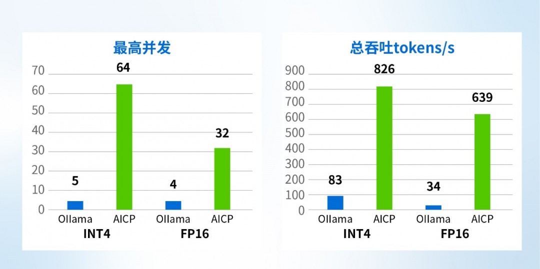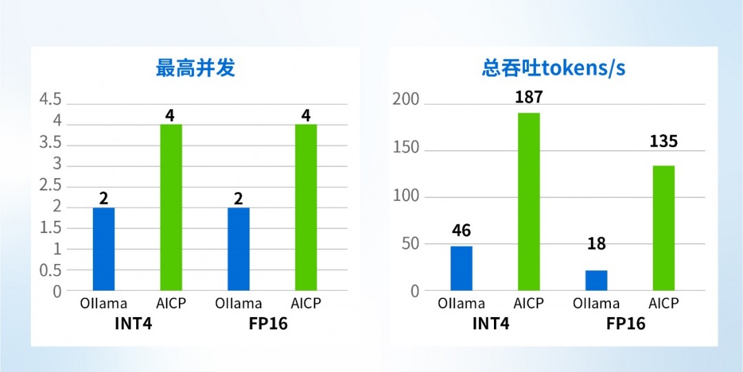 知识库应用场景(4k上下文),AICP并发是Ollama的2倍,总吞吐4~8倍。