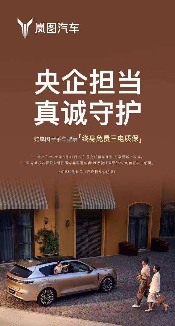 【TechWeb】7月17日消息,岚图汽车日前宣布,从7月16日起,岚图全系车型正式升级为“终身免费三电质保”,在2025年8月31日(含)前完成新车开票的用户享受该权益。