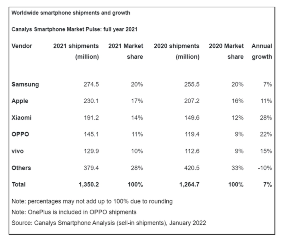 全球范围来看,2021年,智能手机出货量第一是三星,2.75亿部;第二是苹果,2.3亿部;第三是小米,1.912亿部;第四是OPPO,1.451亿部。