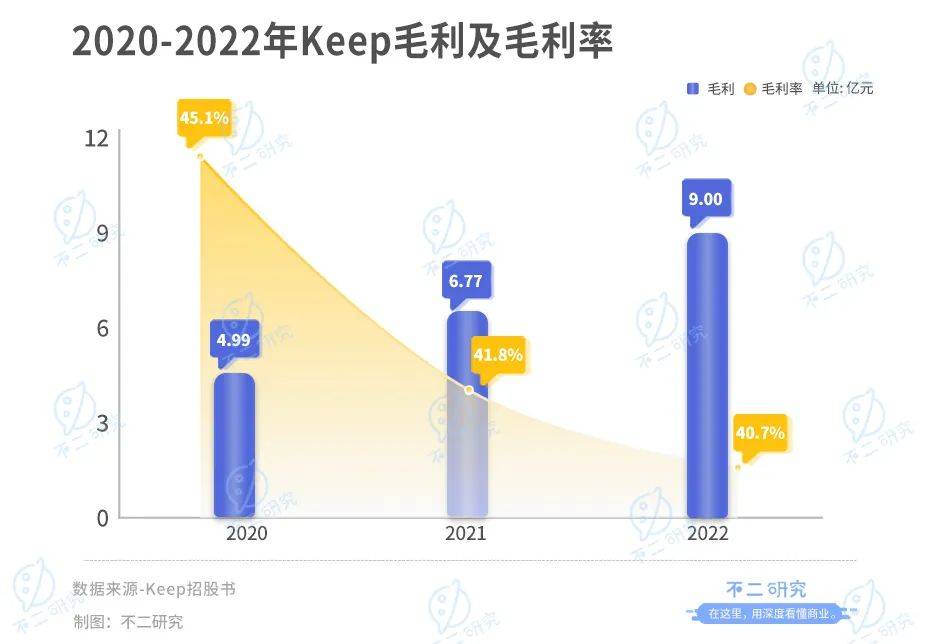 据招股书显示,2020-2022年及2023年一季度,Keep的收入分别为11.07亿元、16.20亿元、22.12亿元和4.47亿元。2020-2022年,keep的毛利分别为4.99亿元、6.77亿元和9.00亿元,毛利率45.1%、41.8%和40.7%。