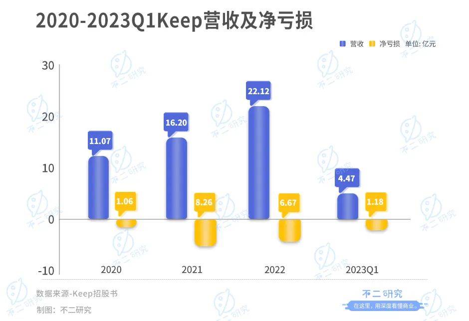 「不二研究」据其新版招股书中发现:2023年一季度,Keep营收为4.47亿元,同比增加7.2%;同期的净亏损为1.18亿元,同比收窄23.87%。